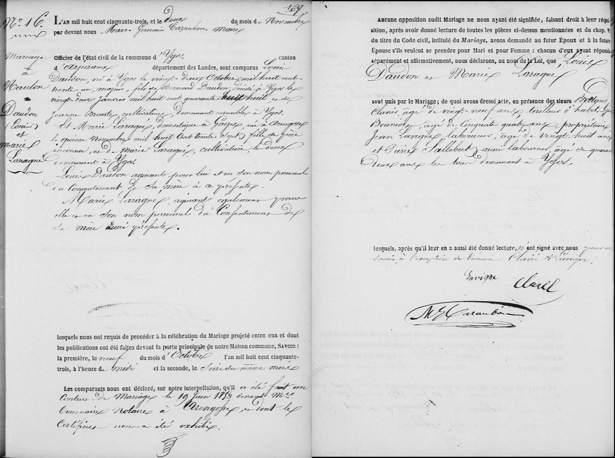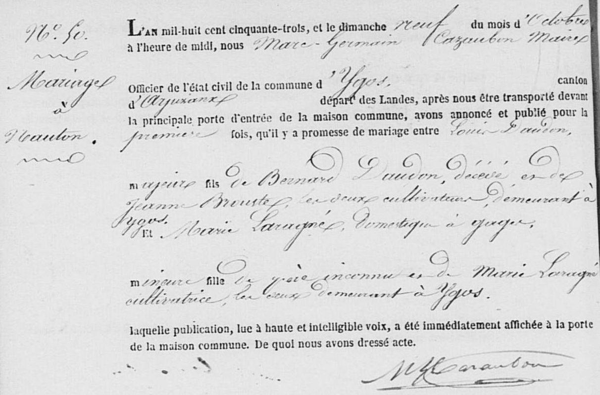 Louis (Jean?) DAUDONNaissance : 22 octobre 1831 38 37 — Ygos-Saint-Saturnin 40333, Landes, Aquitaine, FRA Décès : 20 mars 1872 — Au Pas, Ousse-Suzan 40215, Landes, Aquitaine, FRA |
