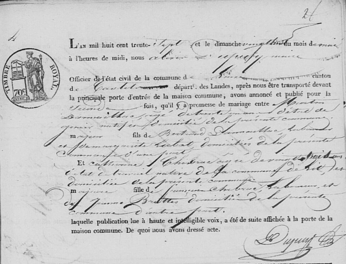 Martin DARMAILLACQNaissance : 16 mai 1806 32 40 — Linxe 40155, Landes, Aquitaine, FRA Décès : après 1863 — Onesse-et-Laharie 40210, Landes, Aquitaine, FRA |