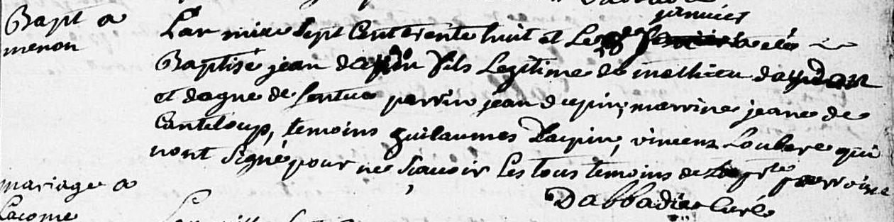 | Baptême d’un frère | Jean DAUDON 8 février 1738 (Âge 5 ans) Témoin : Guilhaume DUPIN — Relation Témoin : Vincens LOUBÈRE — Relation Marraine : Jeanne CANTELOUP — Relation Parrain : Jean DUPIN — Relation |