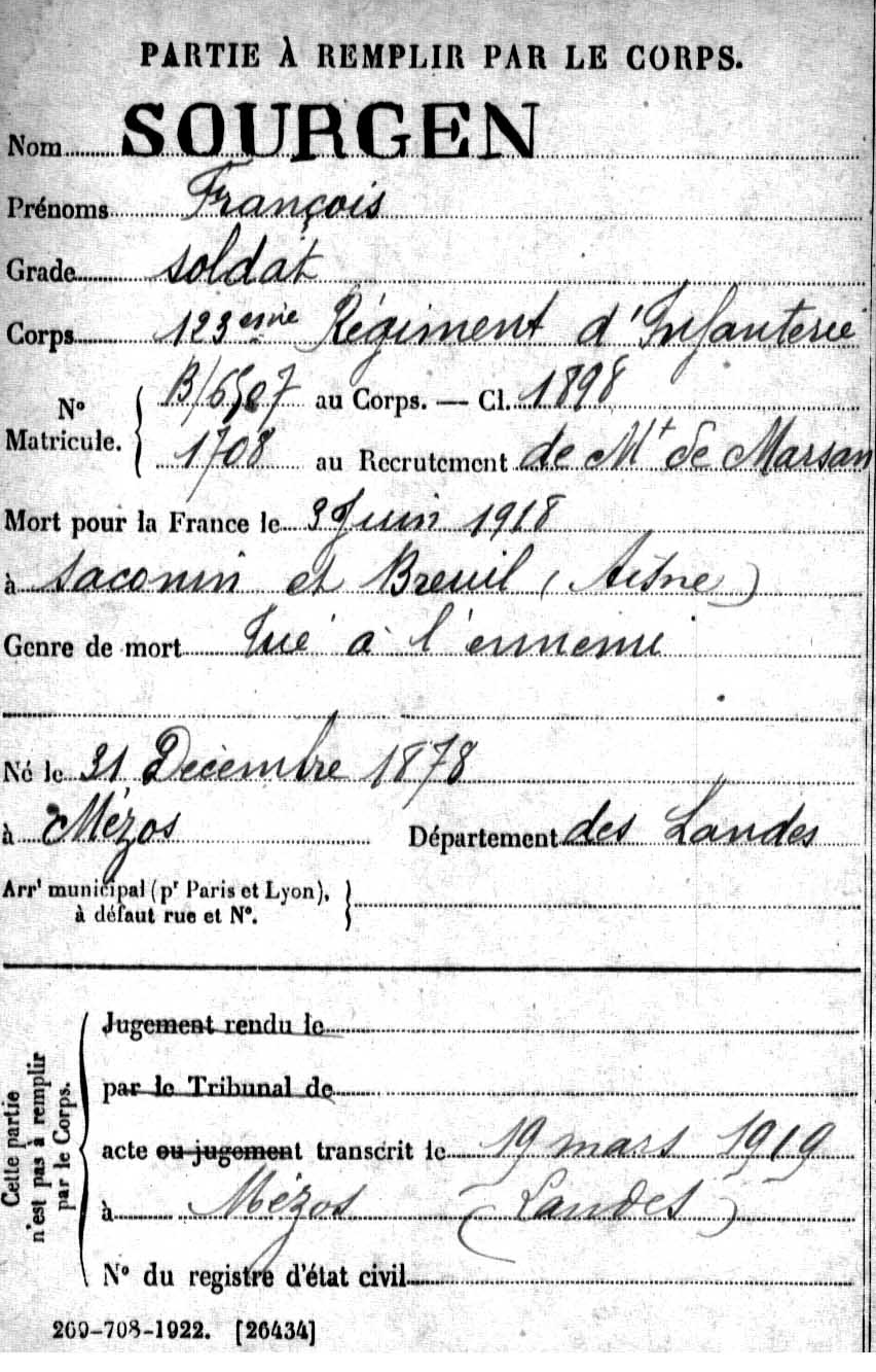 | Décès d’un fils | François « Augustin » SOURGEN 3 juin 1918 (Âge 72 ans) |
