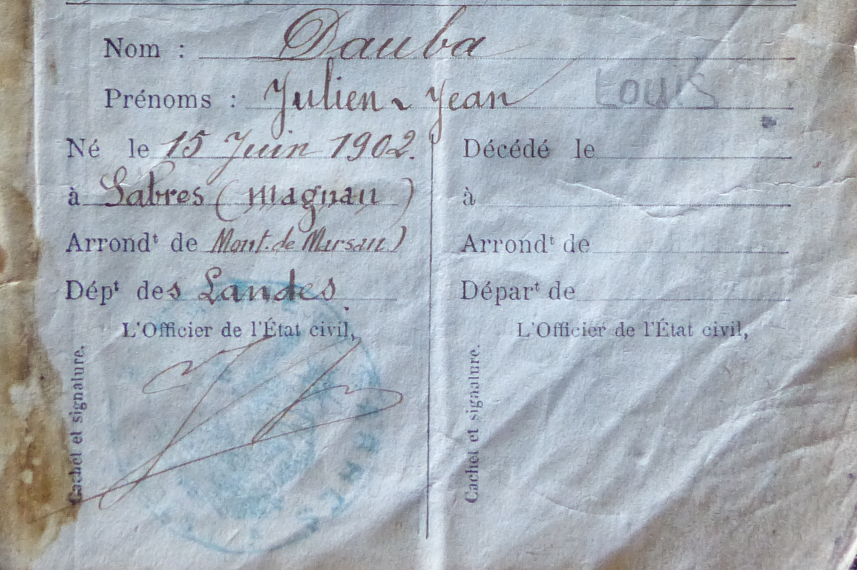 Julien-Jean « Louis » DAUBA Naissance : 15 juin 1902 29 22 — Magnan, Sabres 40246, Landes, Aquitaine, FRA Décès : 29 juillet 1972 — Labouheyre 40134, Landes, Aquitaine, FRA |