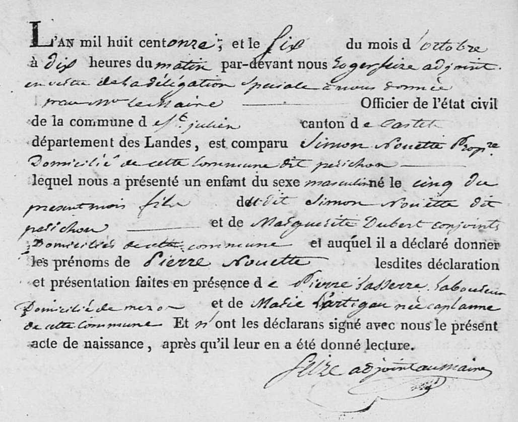 Pierre NOUET(TE) Naissance : 5 octobre 1811 — Saint-Julien-en-Born 40266, Landes, Aquitaine, FRA |