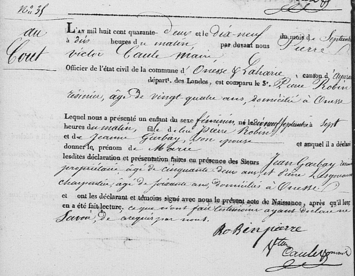 Marie ROBIN Naissance : 19 septembre 1842 24 18 — Cout, Onesse-et-Laharie 40210, Landes, Aquitaine, FRA |
