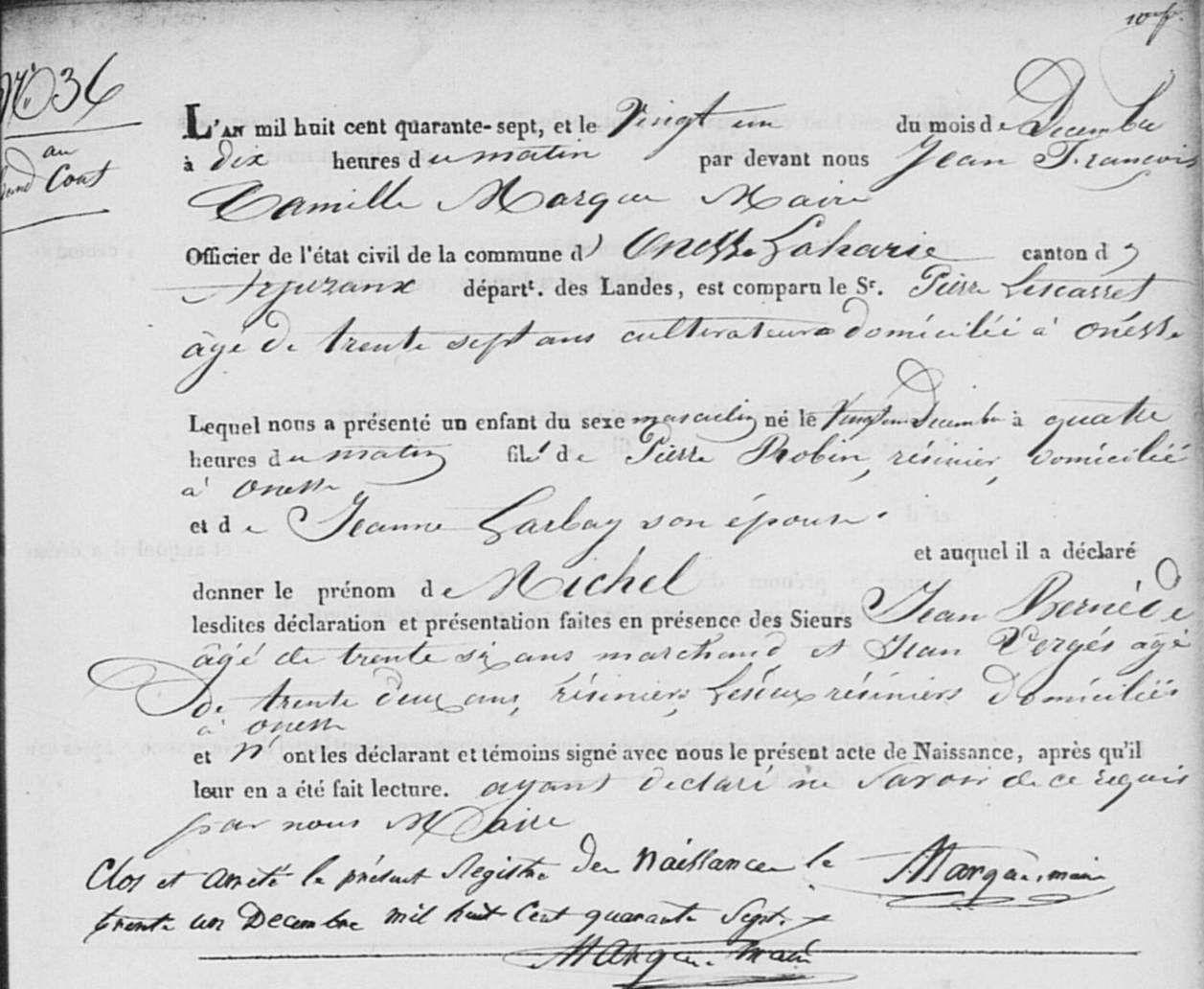 Michel ROBIN Naissance : 21 décembre 1847 29 23 — Cout, Onesse-et-Laharie 40210, Landes, Aquitaine, FRA |