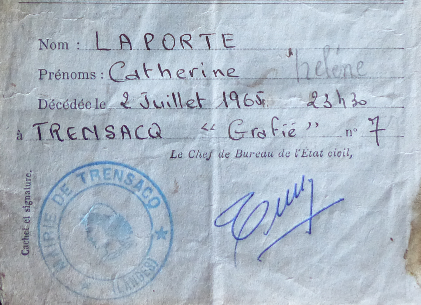 | Décès de la grand-mère maternelle | Catherine « Hélène » LAPORTE 2 juillet 1965 – 23:30 (Âge 42 ans) |