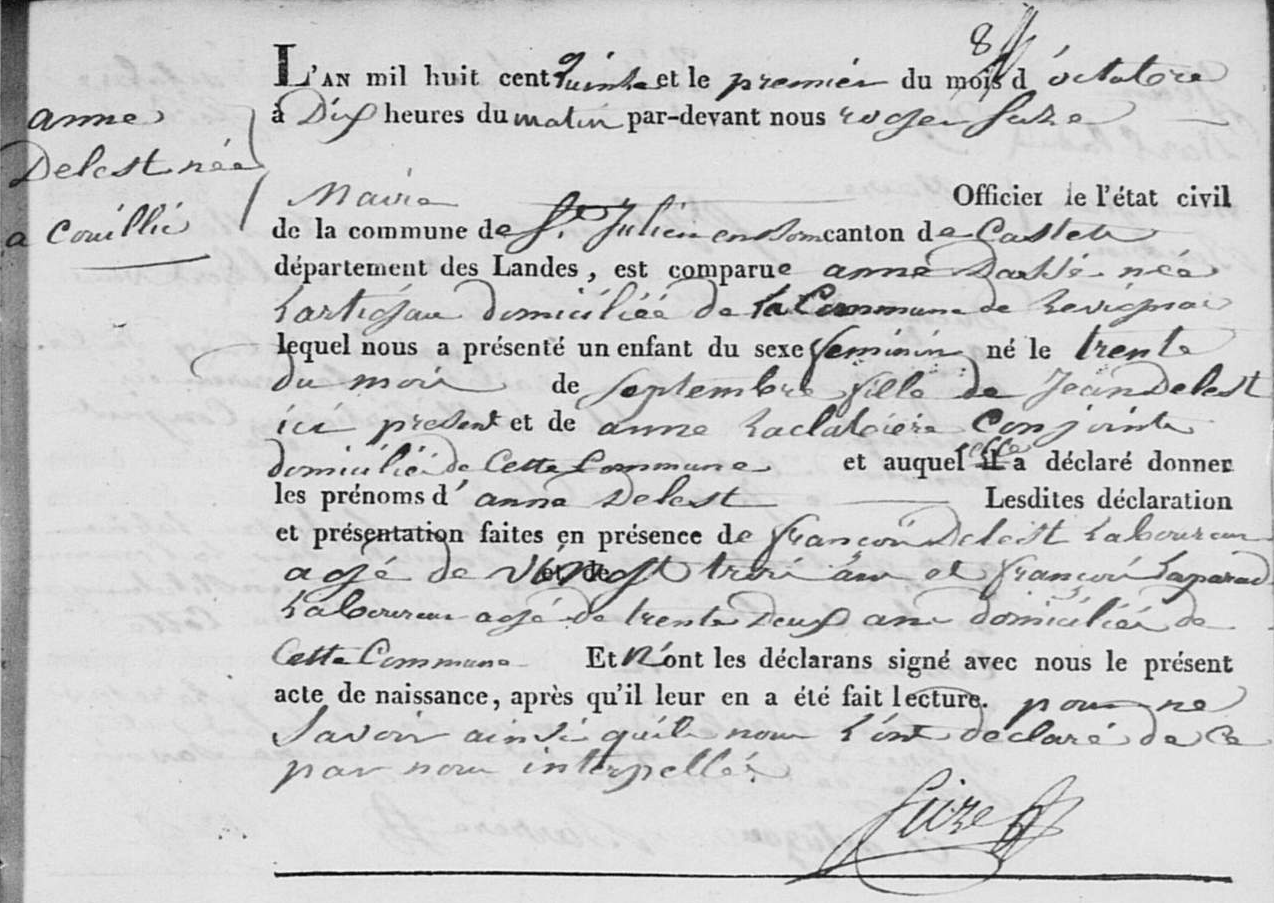 | Naissance d’une fille #1 | Anne DELEST 30 septembre 1815 Note : Mentionné sur son acte de mariage. |