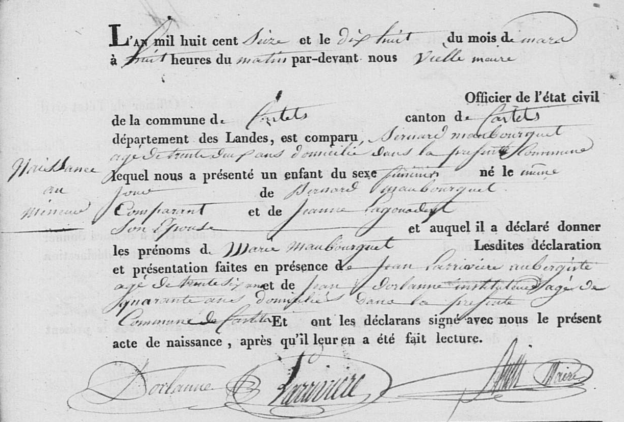 Marie MAUBOURGUET Naissance : 18 mars 1816 35 21 — Castets 40075, Landes, Aquitaine, FRA |