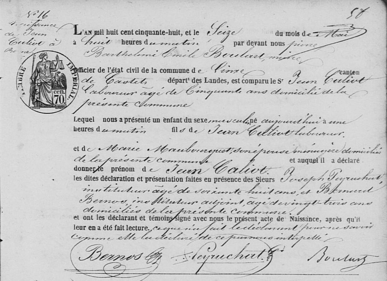| Naissance d’un fils #1 | Jean « Eugène » CALIOT 16 mai 1858 (Âge 42 ans) Note : Mentionné sur son acte de mariage. |