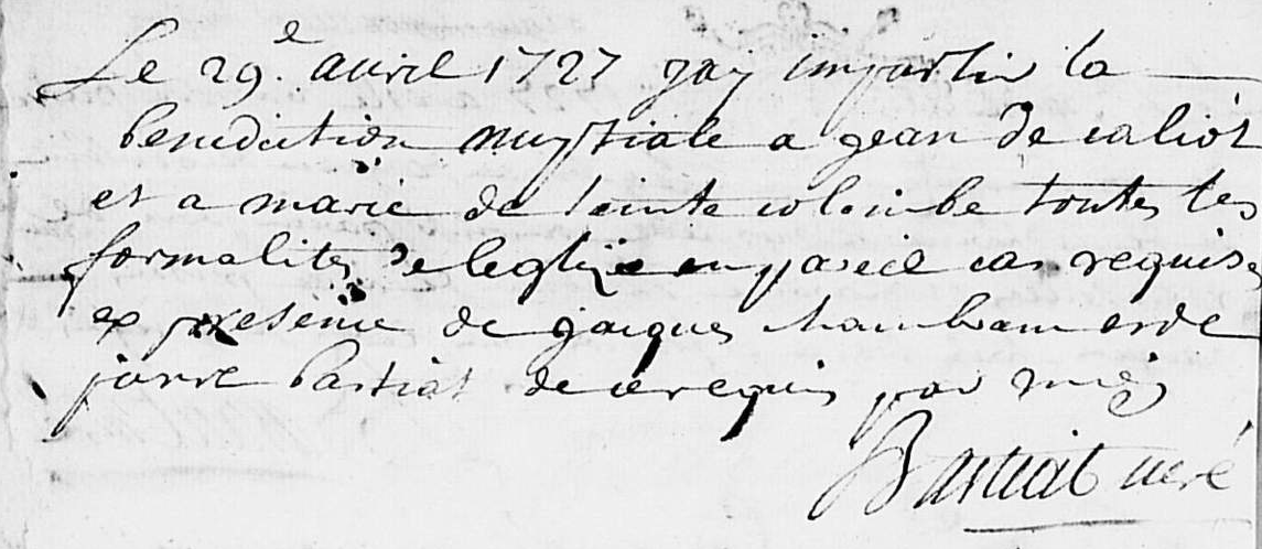 Le 29e avril 1727 j'ay imparti la bénédiction nuptiale à Jean de Caliot et à Marie de Sainte Colombe toutes les formalités de l'église en pareil cas requise en présence de Jacques ***** et de Pierre ***** de ce requis par moy |