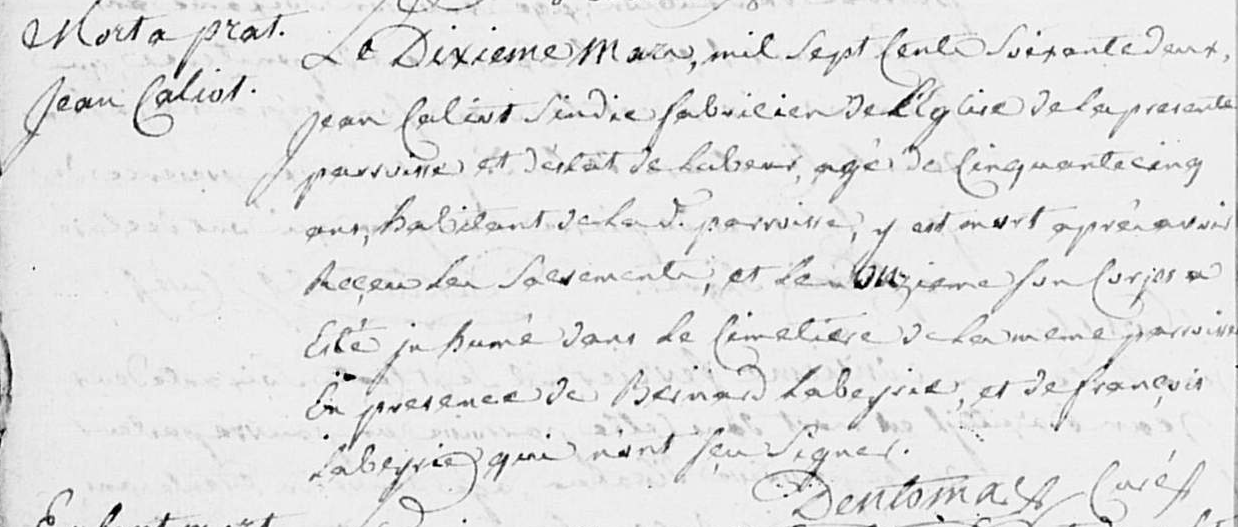 Jean CALIOT Naissance : vers 1707 Décès : 10 mars 1762 — Prat, Lesperon 40152, Landes, Aquitaine, FRA |