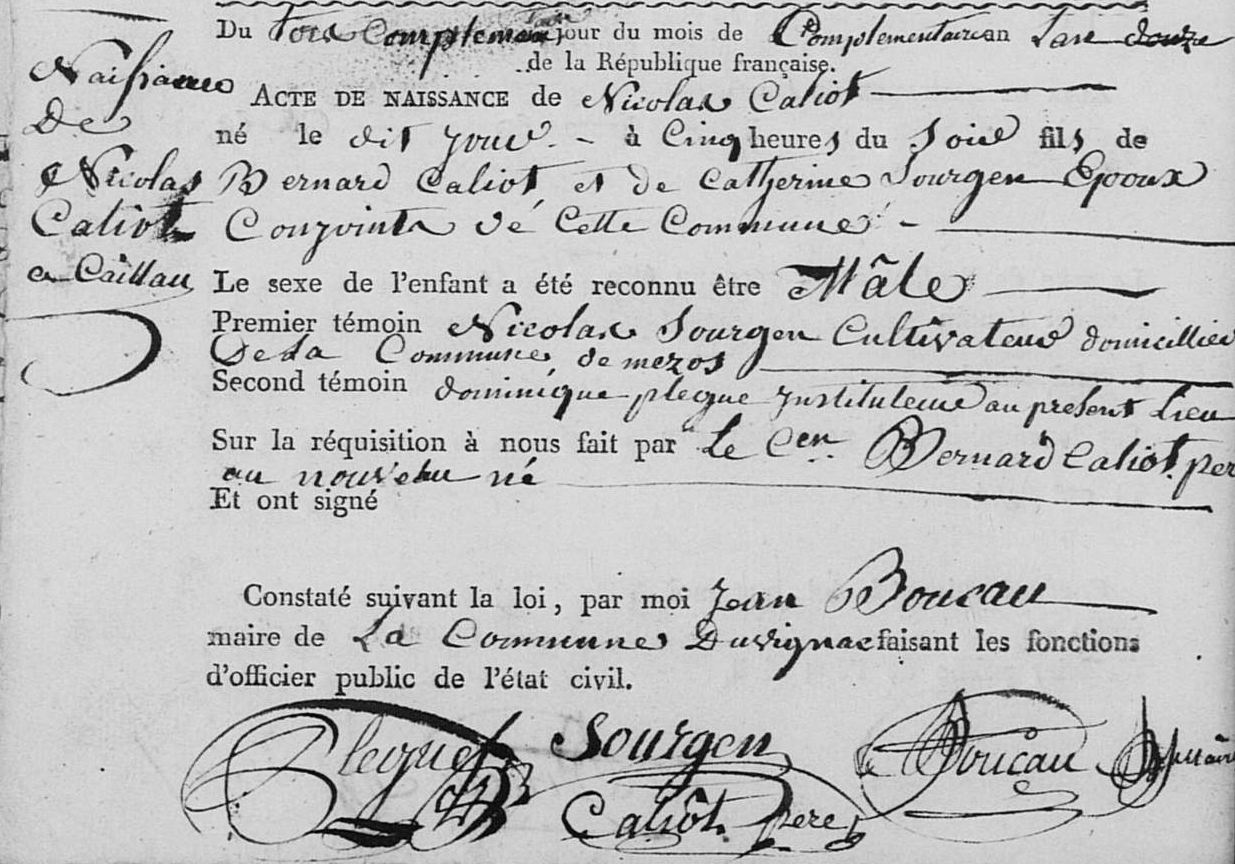 | Décès du père | Bernard « Caillau » CALIOT 6 mars 1815 (Âge 10 ans) |