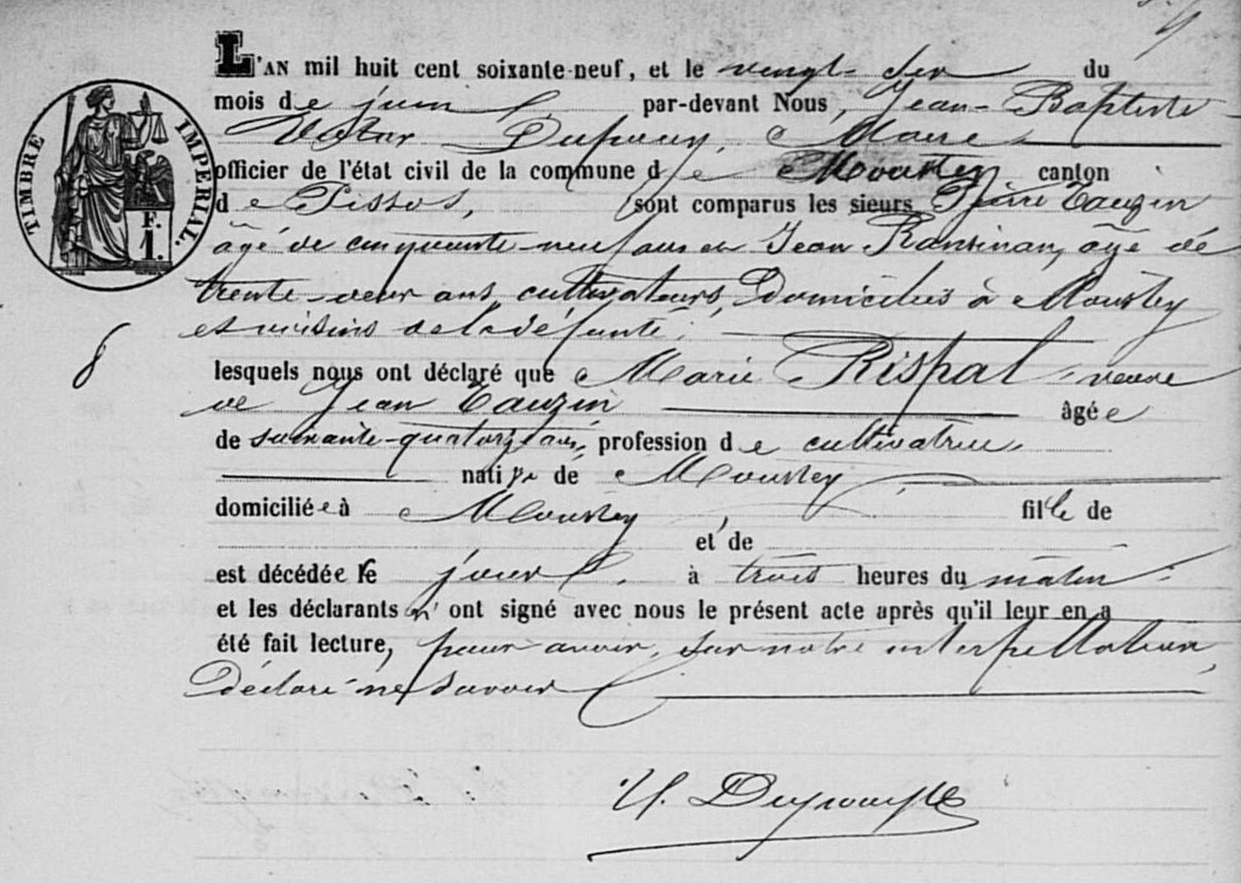 | Décès de la grand-mère maternelle | Marie RISPAL 16 juin 1869 (Âge 23 ans) Âge: 74 |