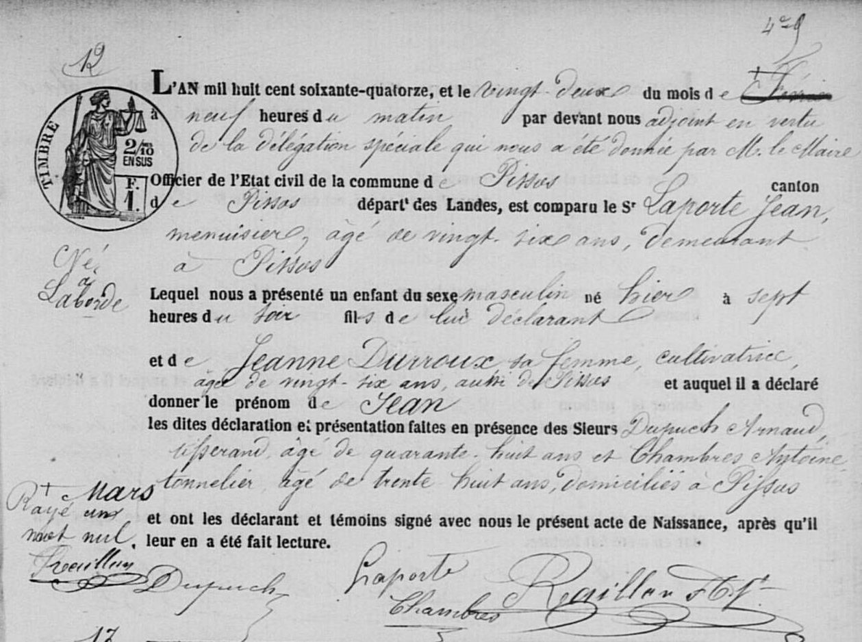 | Naissance d’un fils #1 | Jean LAPORTE 21 mars 1874 (Âge 27 ans) |