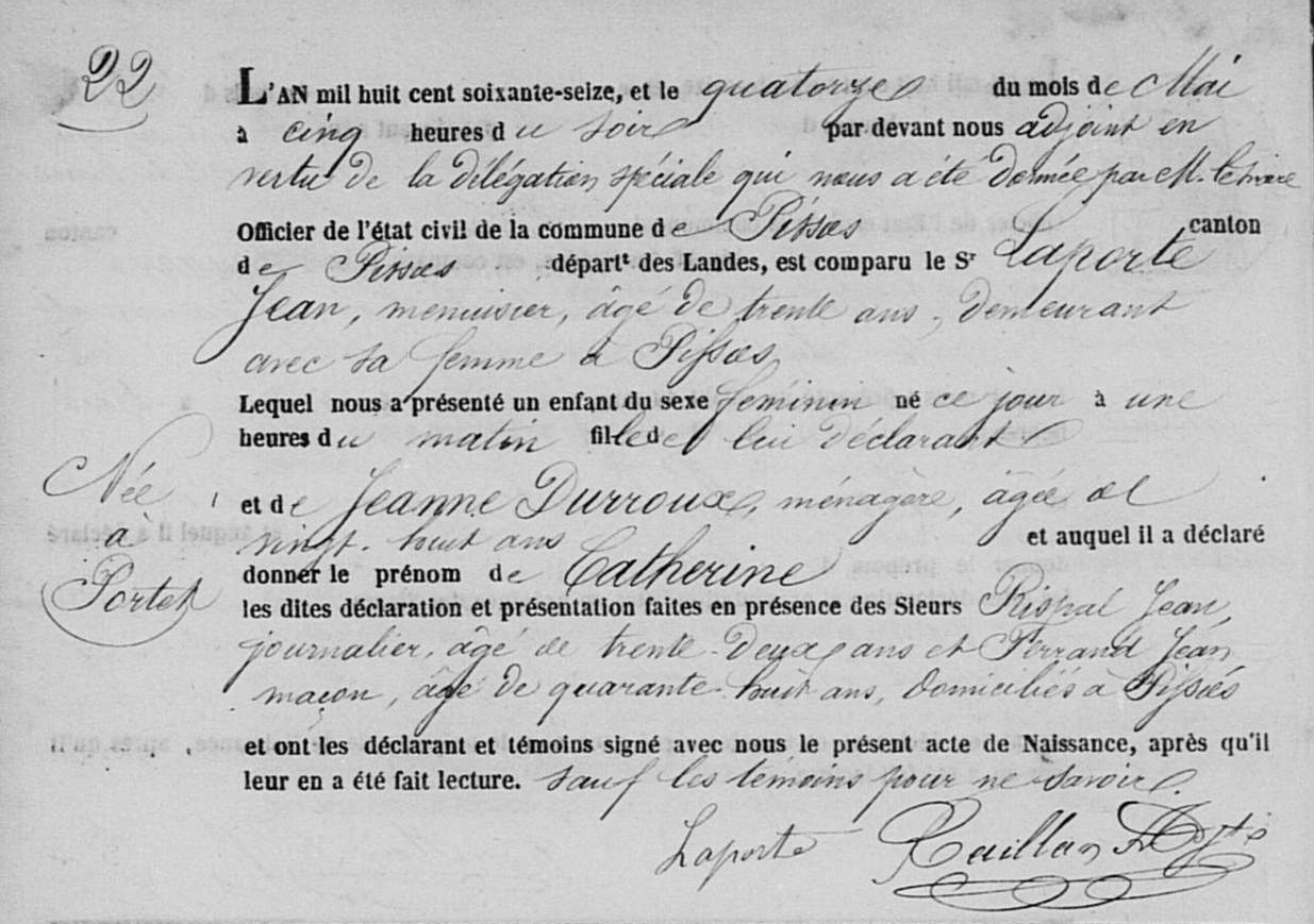 | Naissance d’une fille #2 | Catherine LAPORTE 14 mai 1876 – 01:00 (Âge 27 ans) |