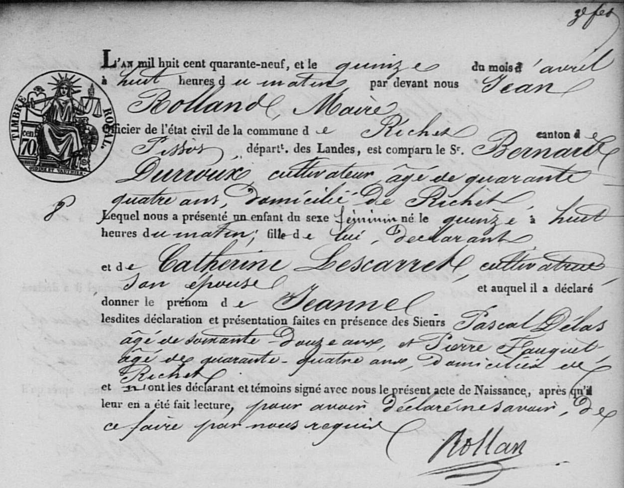 | Naissance d’une fille #2 | Jeanne DURROUX 15 avril 1849 – 08:00 (Âge 43 ans) Note : Mentionné sur son acte de mariage. |