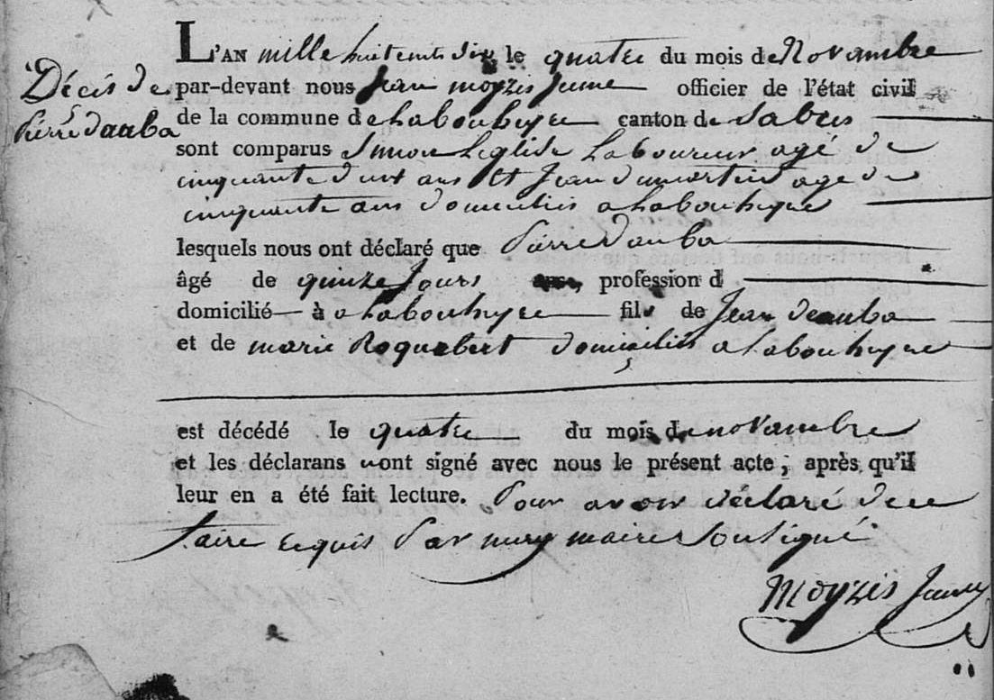 | Décès d’un fils | Pierre DAUBA 4 novembre 1806 (Âge 29 ans) Âge: 15 jours |