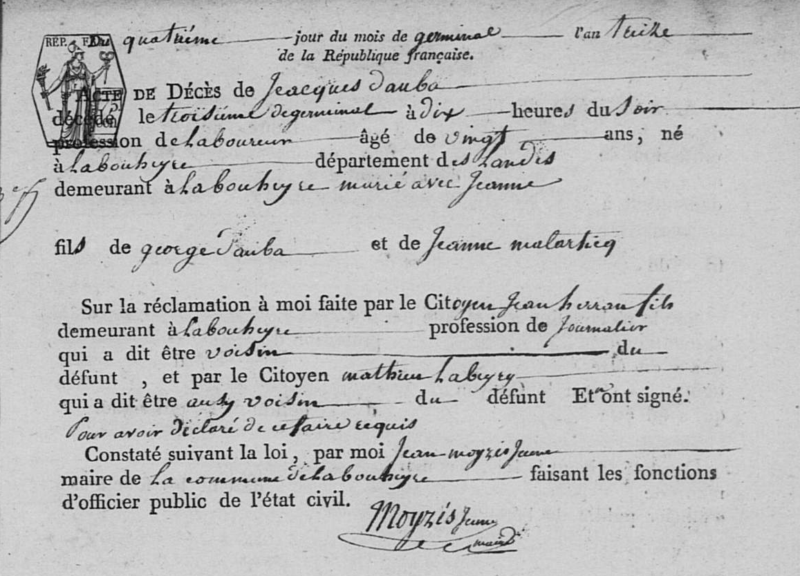 | Décès du père | George DAUBA 7 mai 1805 (17 floréal XIII) – 08:00 (Âge 23 ans) Âge: 68 Note : 17 FLORÉAL AN XIII. Mentionné sur l'acte de mariage de son fils Jean. |