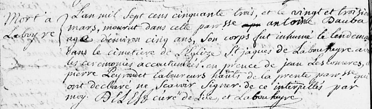 | Décès d’un demi-frère | Antoine DAUBA 23 mars 1753 Note : Mentionné sur son acte de sépulture. |