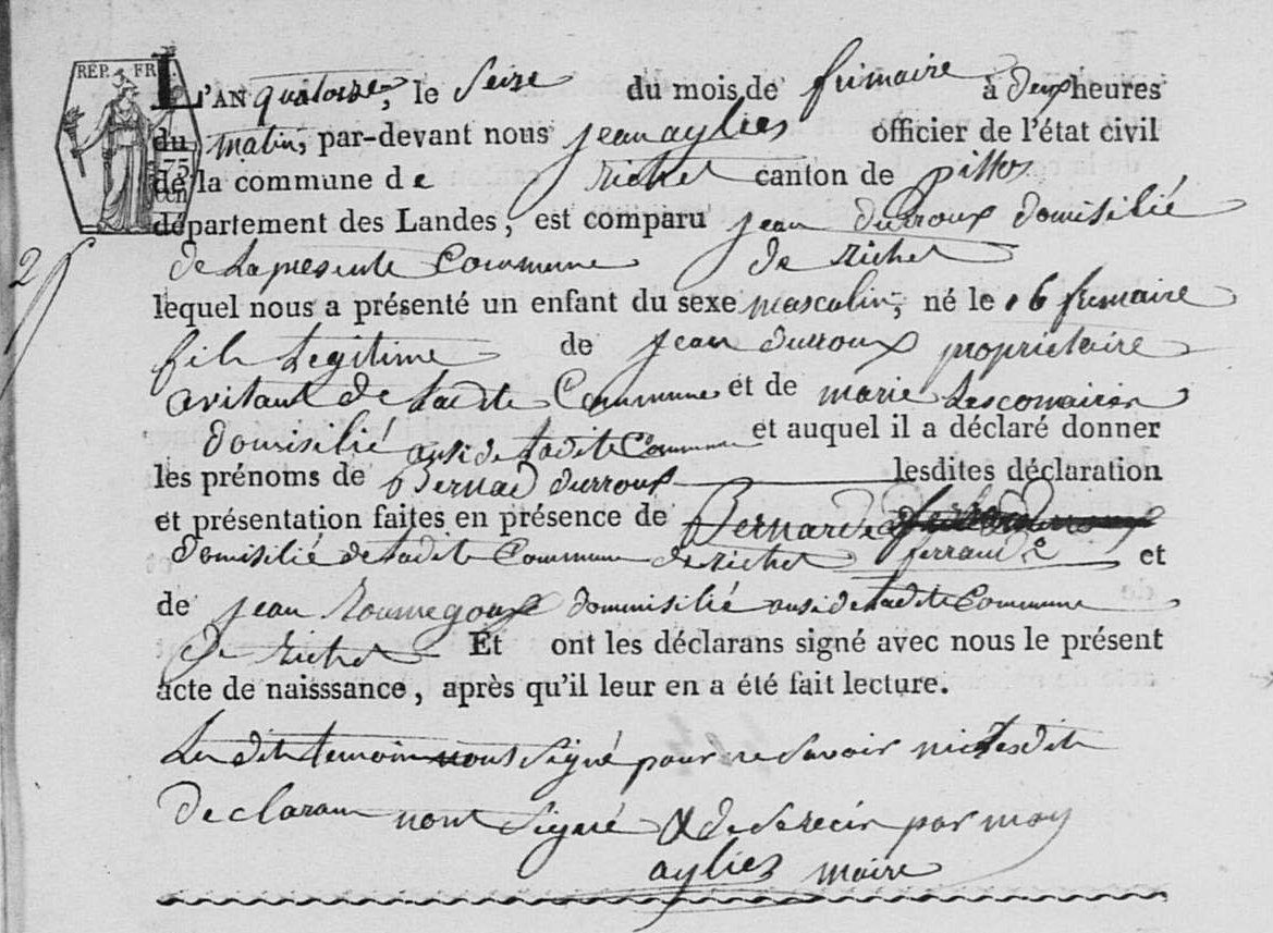 Bernard DURROUX Naissance : 7 décembre 1805 (16 frimaire XIV) 49 37 — Richet, Pissos 40227, Landes, Aquitaine, FRA |