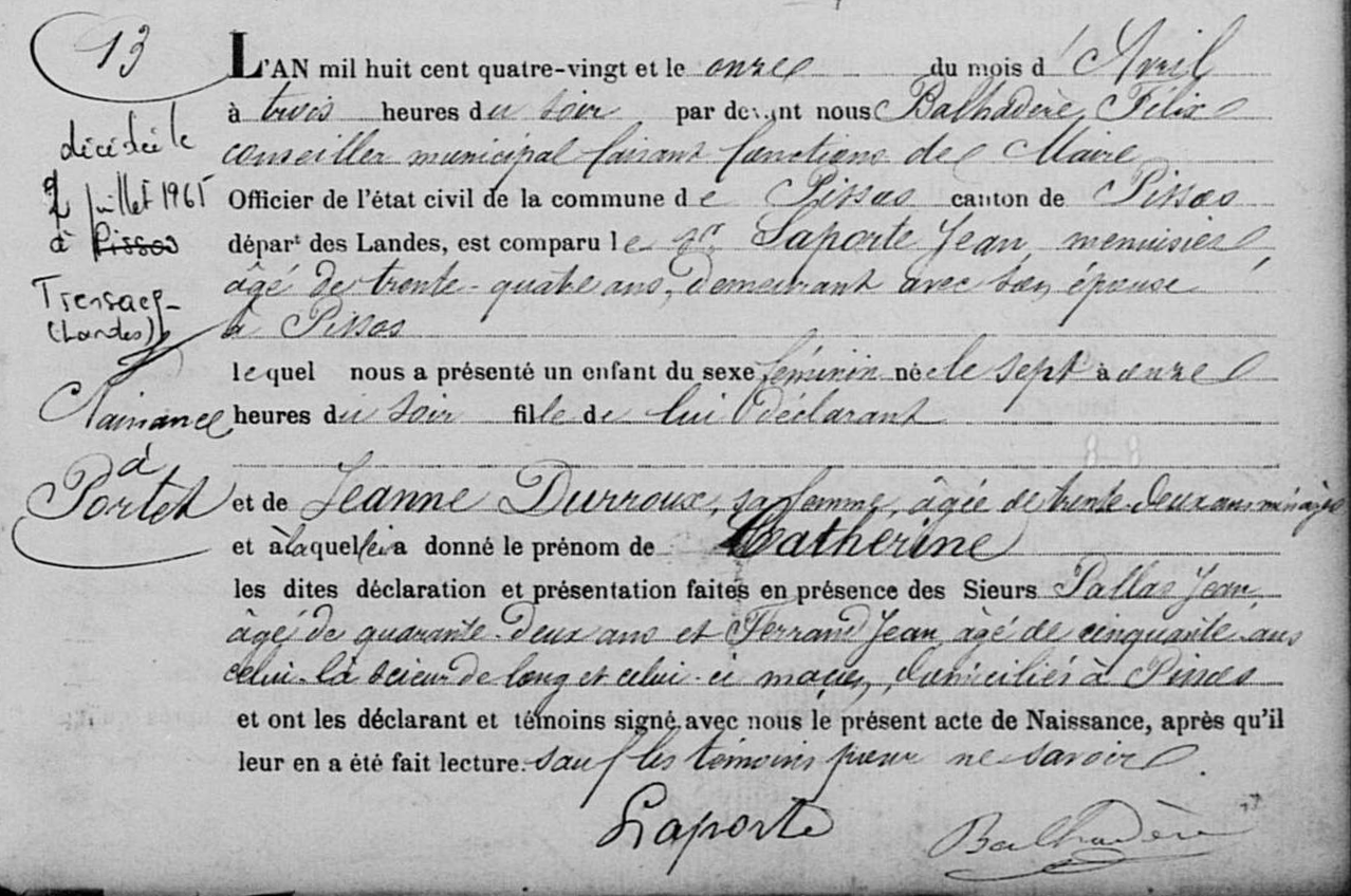 Catherine LAPORTE Naissance : 30 avril 1878 32 29 — Portet, Pissos 40227, Landes, Aquitaine, FRA |