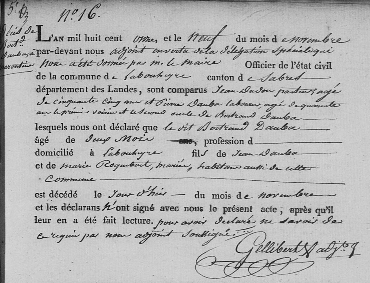 | Décès d’un fils | Bertrand DAUBA 8 novembre 1811 (Âge 40 ans) Âge: 2 mois |