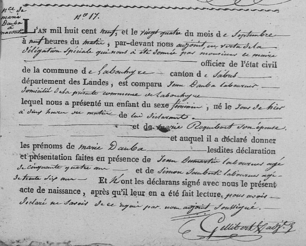 Marie DAUBA Naissance : 23 septembre 1809 32 38 — Maroutine, Labouheyre 40134, Landes, Aquitaine, FRA Décès : 3 octobre 1809 — Maroutine, Labouheyre 40134, Landes, Aquitaine, FRA |