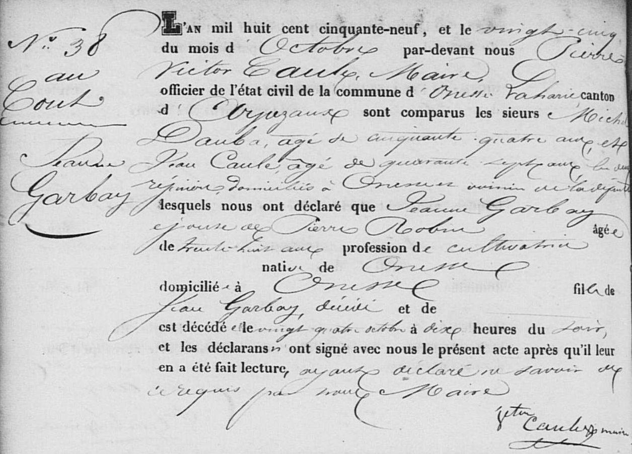 | Décès de la mère | Jeanne GARBAY 24 octobre 1859 – 22h00 (Âge 14 ans) |