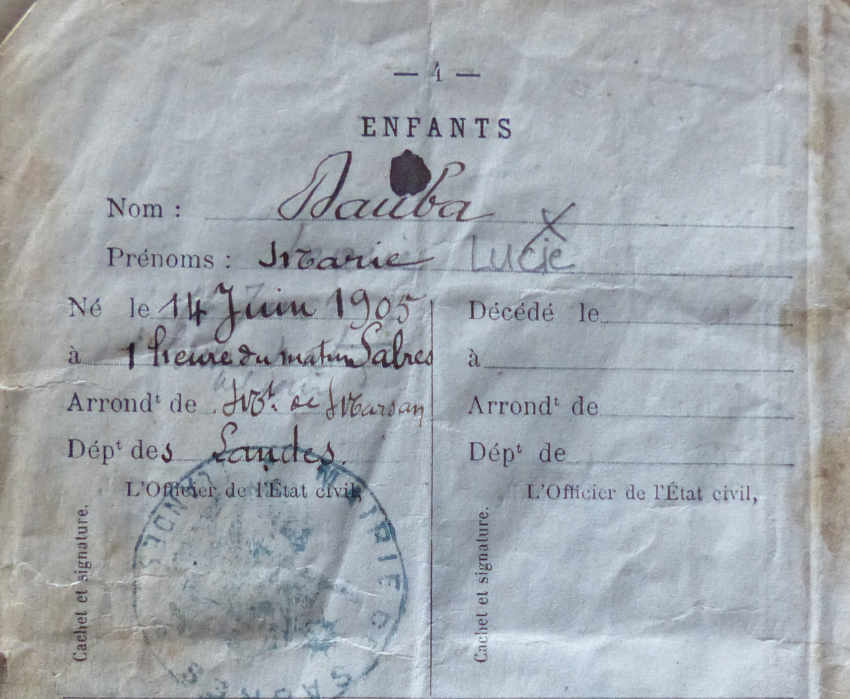 | Marie « Lucie » DAUBA | 14 juin 1905 | 120 | Sabres 40246, Landes, Aquitaine, FRA | 6 | 4 octobre 1977 | 48 | 72 | Sabres 40246, Landes, Aquitaine, FRA | 24 août 2014 - 14:25:49 | F | YES | Y100 | ||||